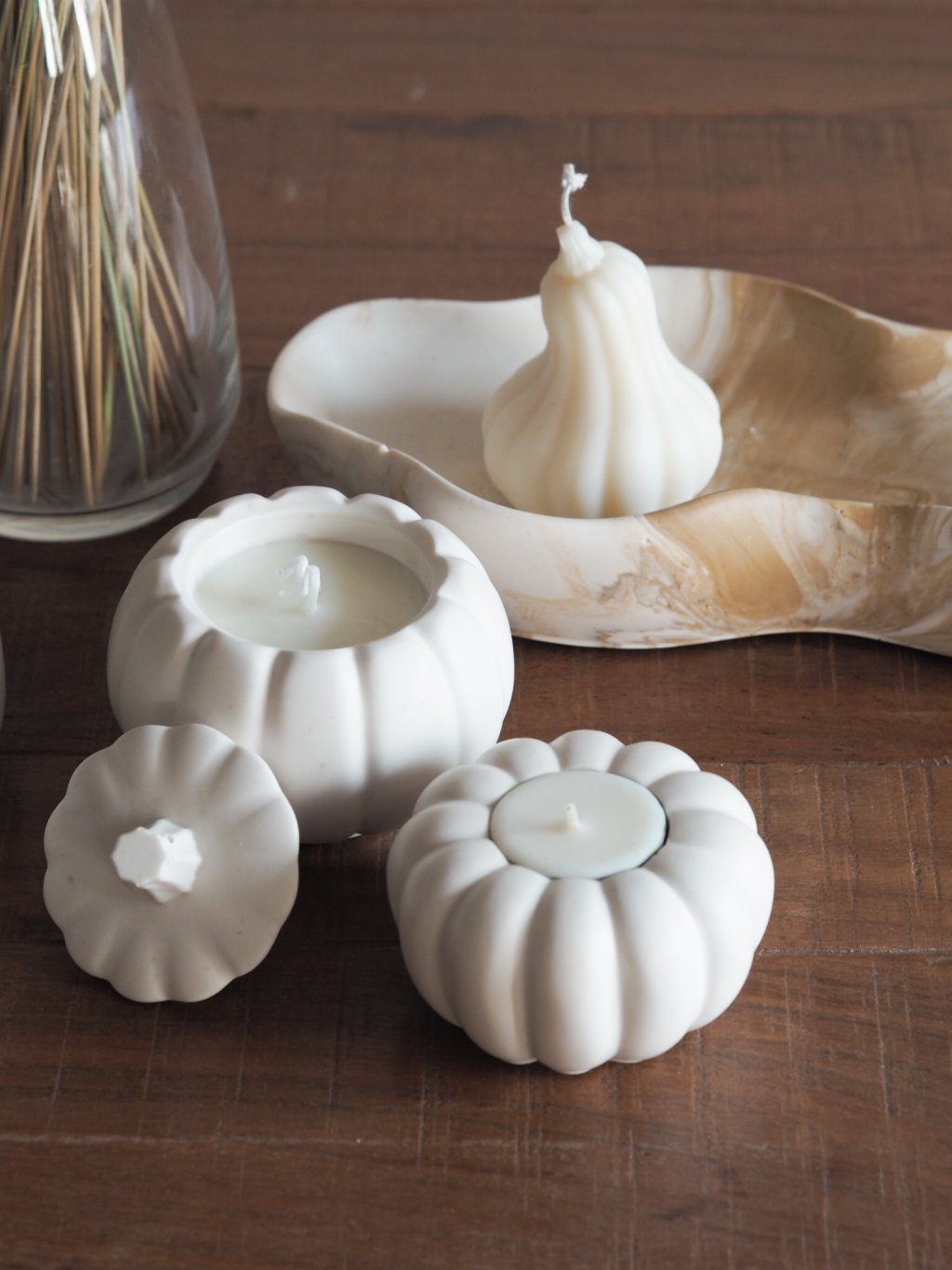 Vonná svíčka ve tvaru dekorativní dýně ze směsi přírodních vosků.