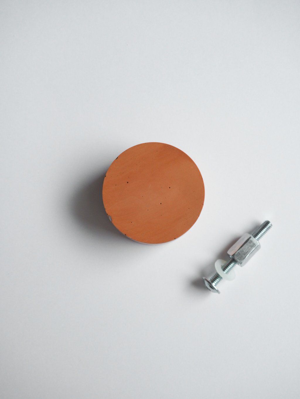 Na šroub navlečte plastovou podložku a umístěte jej z vnitřní strany nábytku. Z vnější strany našroubujte distanční matici a lehce utáhněte. Poté našroubujte úchytku a dotáhněte pomocí šroubováku.